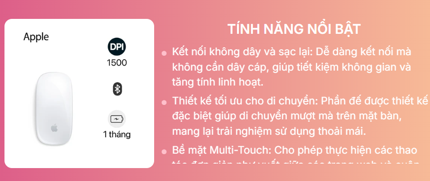 Chuột Apple Magic Mouse 3 được tích hợp công nghệ không dây Bluetooth, bề mặt Multi-Touch tiện lợi và pin sạc hoạt động lên đến một tháng mỗi lần sạc. Chuột có trọng lượng chỉ 0.099kg và kích thước nhỏ gọn 11.35 x 5.71 x 2.16cm, dễ dàng mang theo. Mẫu chuột Apple này có khả năng tương thích tốt với macOS 15.1 và iPadOS 18.1 trở lên, với màu trắng tinh tế làm chủ đạo.